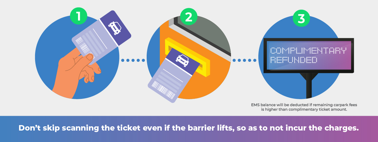 If you are registered for EMS, the car park fees will be charged through the service, even if you have a card in the In-Vehicle Unit or On-Board Unit. If you have a complimentary ticket, you can present it at the car park exit gantry, and your EMS transaction will be reversed.